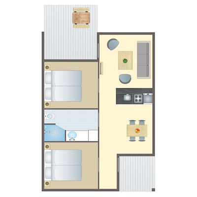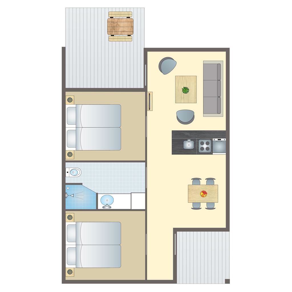 Feriehus med egen delvis overbygd terrasse hvor alle kan sitte i hagemøblene og nyte ferien sammen. Stue i åpen forbindelse med kjøkken/allrom, slik at dere er sammen, uansett om noen lager mat, mens andre koser seg i sofaen eller ser på TV. 2 soverom med 2 soveplasser hver, og en stue med sovesofa for 2 personer. Da ferieboligene er privateiet, kan beskrivelsene, bildene, spesifikasjonene og planløsningene for boligene variere.