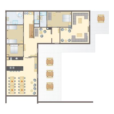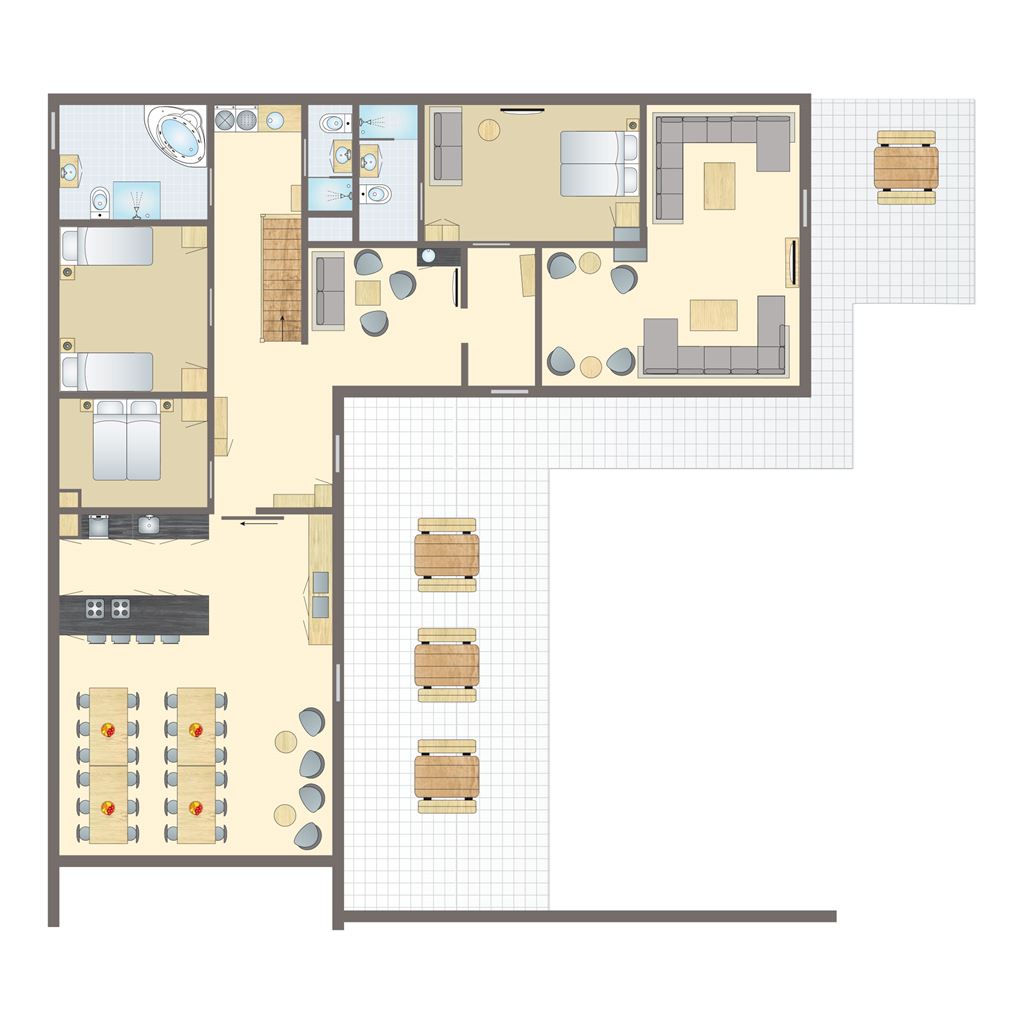 Et superlekkert og svært romslig feriehus med plass til opptil 22 personer. Huset er praktisk innredet med øye for detaljer. Det er tenkt stort når det gjelder antall soverom og bad, noe som gjør huset ideelt til mange forskjellige formål som f.eks. familiesammenkomster, teambuilding for bedrifter eller leirskoleopphold. Da ferieboligene er privateiet, kan beskrivelsene, bildene, spesifikasjonene og planløsningene for boligene variere.