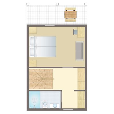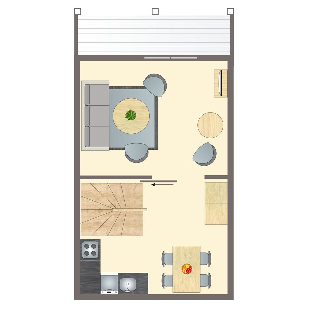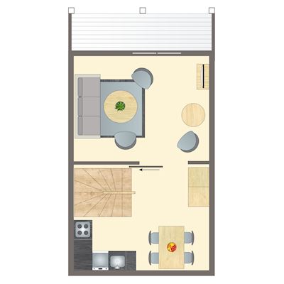 Feriehus i to plan. Første etasje med kjøkken og spiseavdeling med oppvaskmaskin i forbindelse til stuen, som har utgang til altan. 1 soverom i første etasje med dobbeltseng og sovesofa, samt en sovesofa i stuen med plass til to barn og utgang til egen terrasse med trebord/benkesett. Da ferieboligene er privateiet, kan beskrivelsene, bildene, spesifikasjonene og planløsningene for boligene variere.